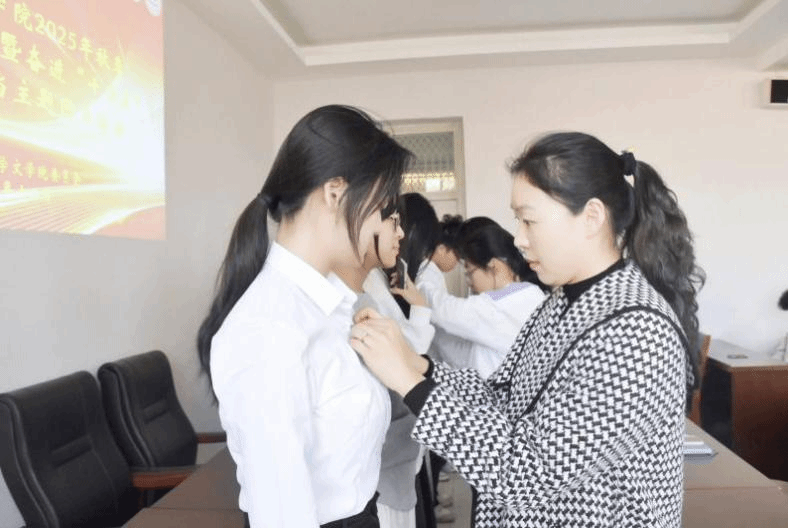 随后,文学院团委书记张莉和优秀团员代表共同为新团员佩戴团徽、颁发团员证,崭新团徽熠熠生辉,承载着青年一代的责任与担当,标志着新团员开启青春新征程。