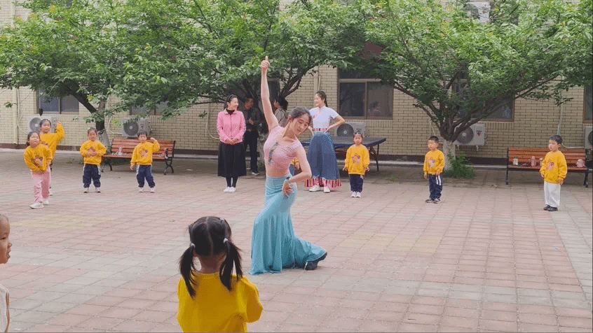 此次活动在民族舞蹈的精彩展演中拉开序幕。舞蹈班的学生们,身着藏族、傣族及胶州秧歌的传统服饰,以优雅而灵动的舞姿,生动展现了各民族舞蹈的独特魅力。特别是非遗项目——胶州秧歌的表演,尤为令人瞩目。学生们不仅通过精准的动作示范,还结合深入的历史讲解,引领孩子们领略传统文化的丰富内涵。在互动环节,担任“小老师”的学生们亲授舞扇技巧,孩子们兴趣盎然,现场洋溢着欢声笑语。