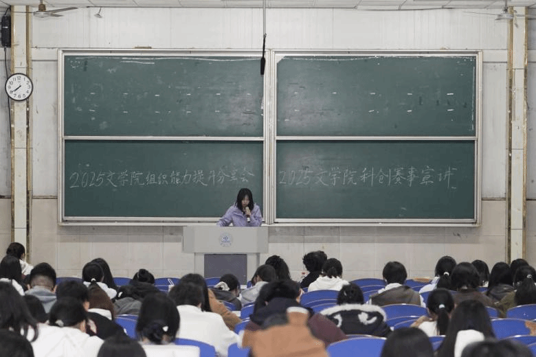 随后,学生会创新创业部部长张欣茹以“赛事赋能,创意筑梦”为主题开展专题分享。她系统梳理了“挑战杯”、大学生创新创业训练计划等重点赛事,通过展示学院往届学子在比赛中斩获佳绩的案例,详细解析选题思路、备赛技巧与团队协作要点。分享中,她特别强调:“文学院学子的人文素养与创意能力是参与科创的独特优势,希望大家以兴趣为帆,用专业为桨,勇敢迈出实践第一步。”