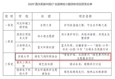 近日,生态环境部公布2025“清洁美丽中国行”全国高校小额资助项目获奖名单,william威廉亚洲官方绿色飞翔环保协会申报的“青春护绿 水润黄河”绿色黄河科技志愿服务项目凭借扎实的实践成效与创新的服务模式,成功斩获三等奖!