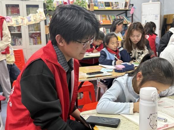 活动现场,志愿者们面对面地为孩子们答疑解惑。针对孩子们在作业中遇到的困惑,志愿者们耐心讲解,引导孩子们主动思考,帮助他们从多个角度探索解题思路,并及时解决课业问题。完成课业辅导后,志愿者们陪伴孩子们阅读课外书籍,并为孩子们提供合适的学习方法。通过这些举措,志愿者们为孩子们打造了一个温馨、充实的课后学习空间,让“四点半课堂”成为孩子们收获知识、快乐成长的美好时光。
